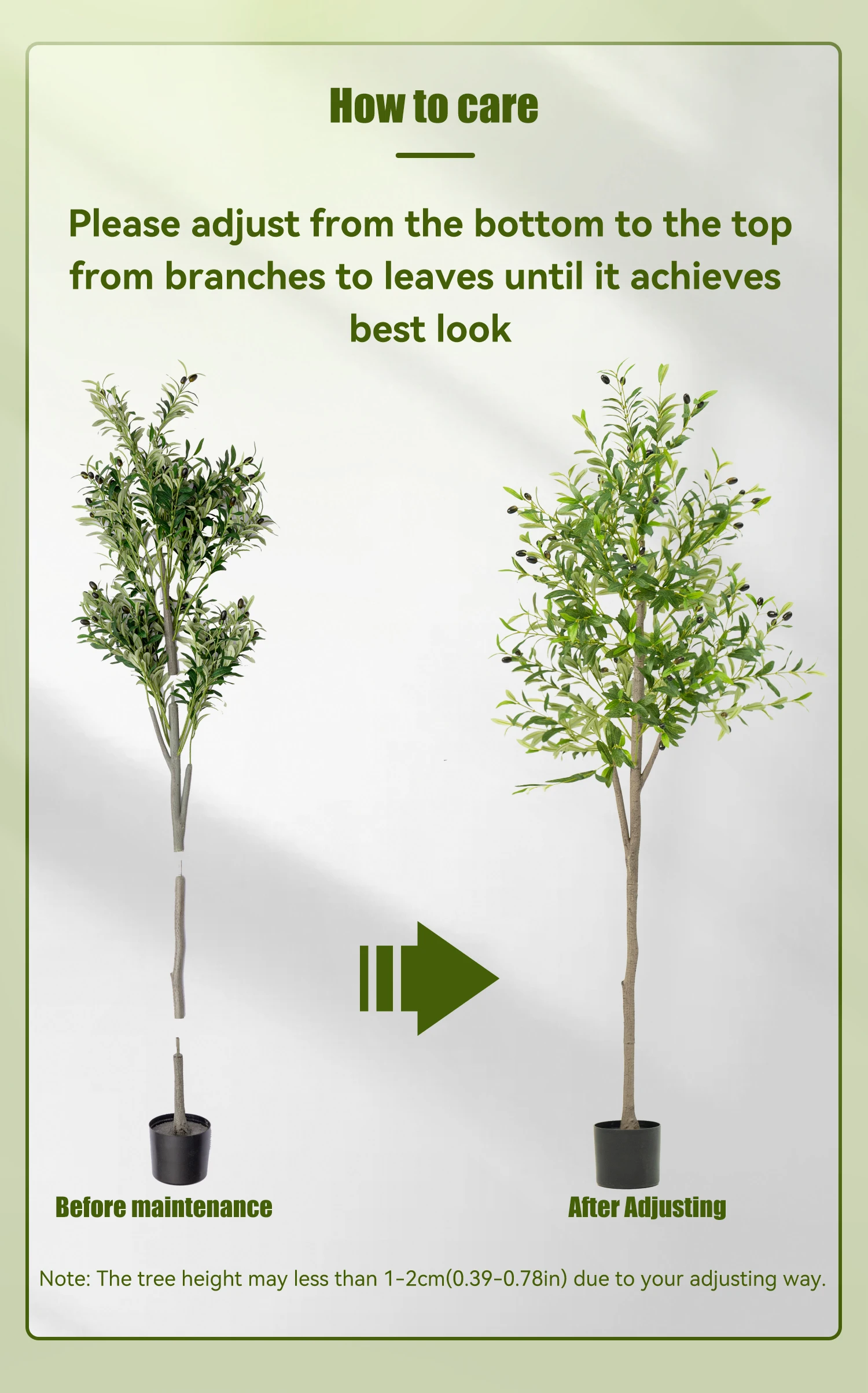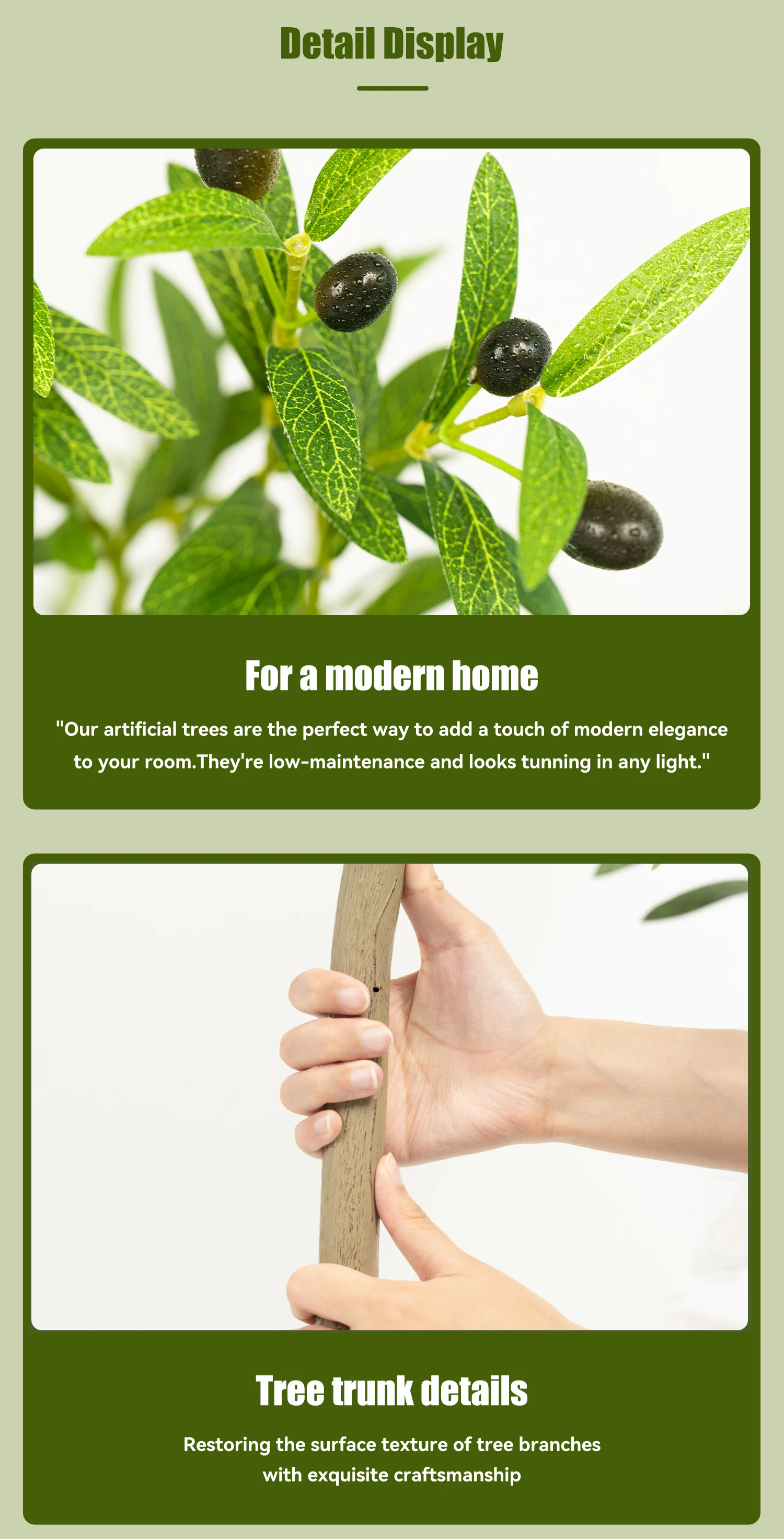 2.Our artificial olive trees are pre-assembled in heavy-duty pots made of plastic and concrete, so each tree can stand independently. In addition, the pots are moderately sized to bring the best decorative effect to your home and office.