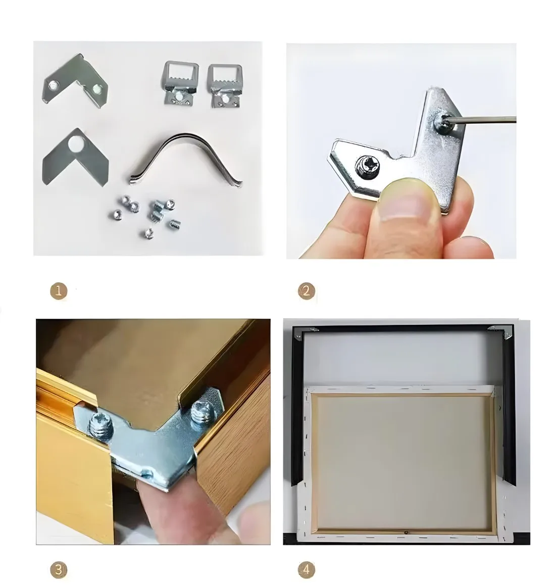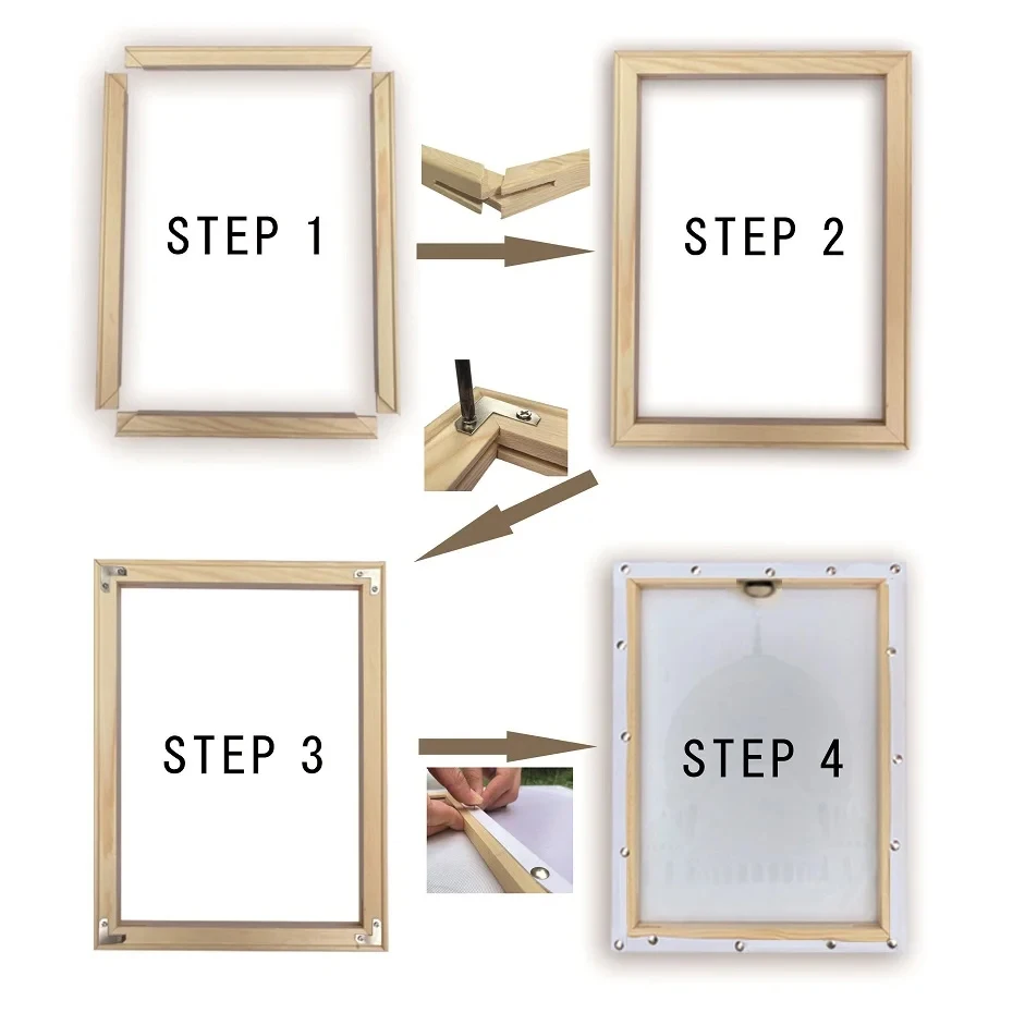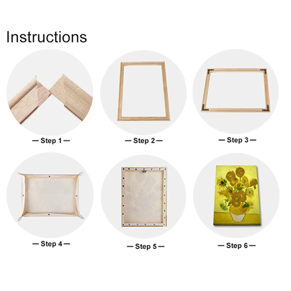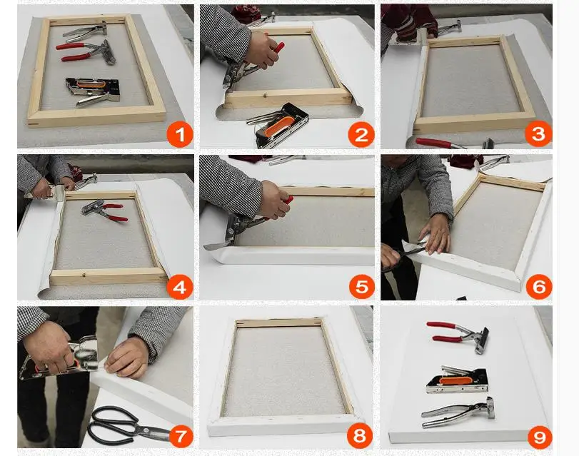 After installation, please measure whether the diagonal distances are the same. If not, please make adjustments before repairing. Otherwise, the angle may not reach 90 degrees (please note this is crucial). After ensuring proper installation, stretch your canvas onto the wooden frame