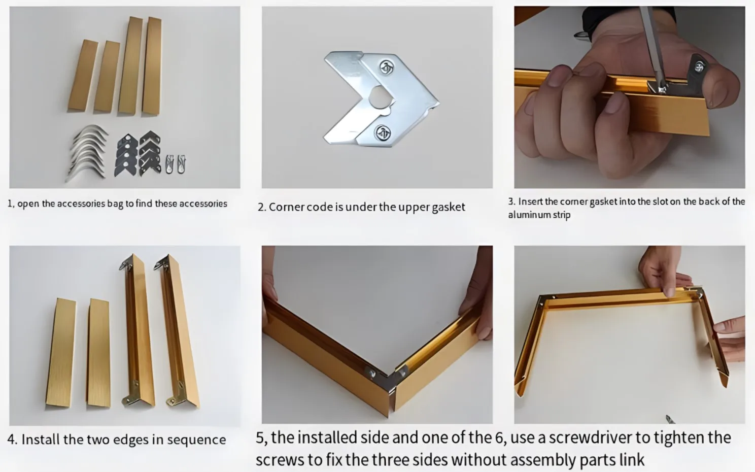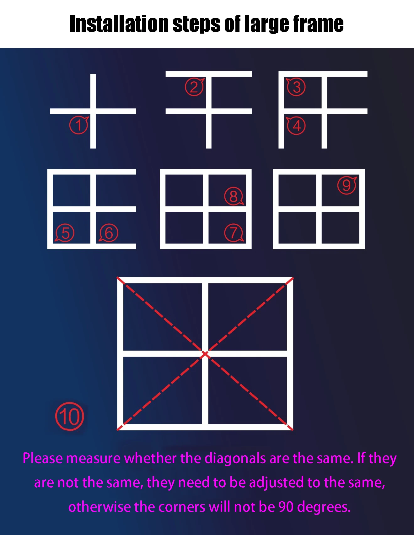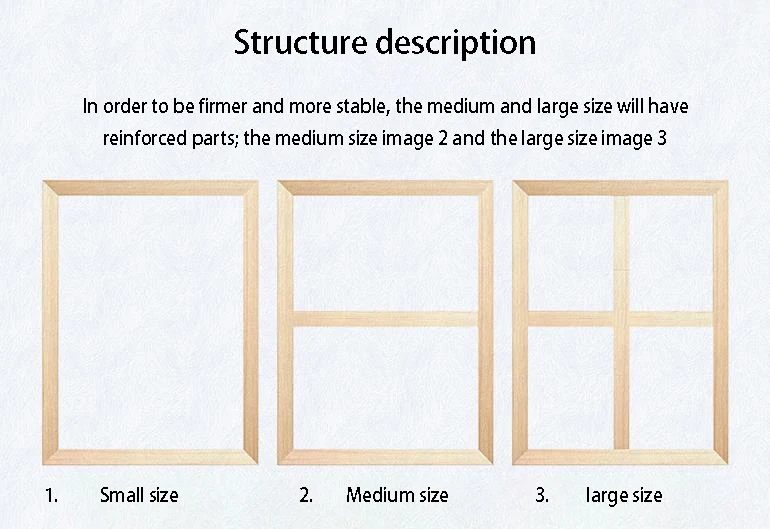 After installation, please measure whether the diagonal distances are the same. If not, please make adjustments before repairing. Otherwise, the angle may not reach 90 degrees (please note this is crucial). After ensuring proper installation, stretch your canvas onto the wooden frame