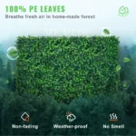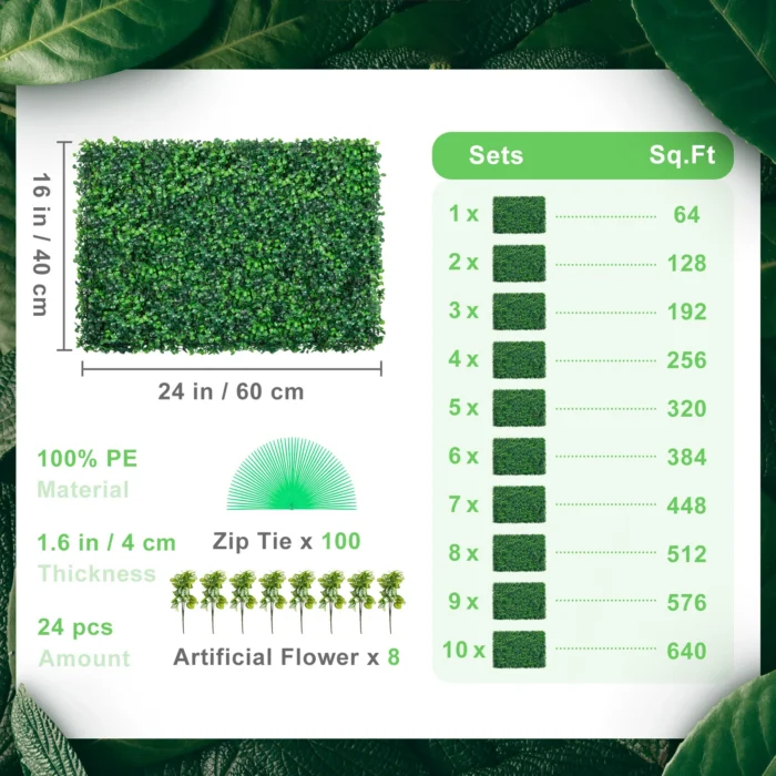 Durable 100% PE: Size: 24'' x 16"; Quantity: 24 pcs; Covering: 64 sq.ft; Thickness: 1.6''. The green wall is made of polyethylene, sun-proof, non-fading, unbreakable, and withstands all weather conditions for years to come. Get ready to make any space stand out and show off your love for nature! Also, our plant walls are odorless, suitable for your home, and friendly to the old and children. It is SGS certificated.
